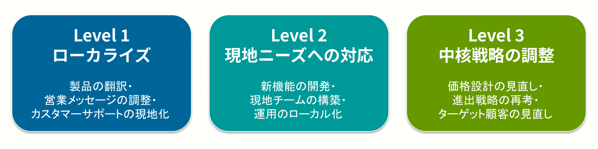 私はこれまで、エンタープライズ向けSaaSと、オペレーションを重視するマーケットプレイス事業の両方で国際展開に携わってきました。課題は多岐にわたりますが、成功する事業展開のほとんどは下記のような3レベルにわたるパターンをたどります。